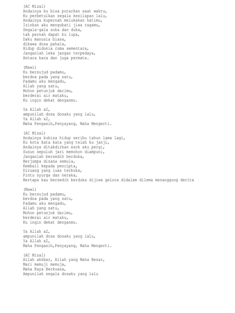 Ampunilah dosa-dosaku yang lalu. 4 dari 5 Posted On. Lirik Lagu Al Haq Mawi Feat AC Mizal Lirik Lagu Al Haq Mawi Feat AC Mizal AC Mizal Andainya ku bisa putarkan saat waktu Ku perbetulkan segala kesilapan lalu Andainya kupernah melukakan hatimu Izinkan aku mengubati jiwa ragamu Segala-gala suka dan duka tak pernah dapat ku lupa Daku manusia biasa dibawa dosa pahala.